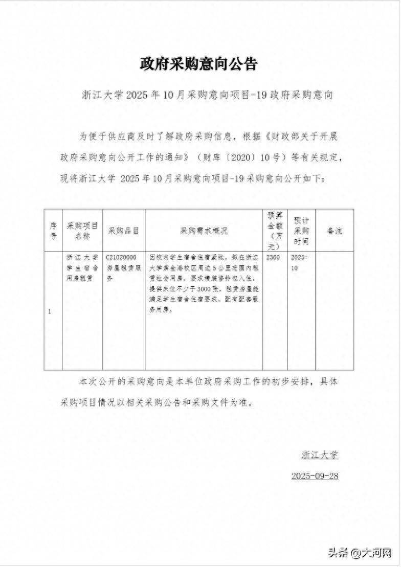 近日,浙江大学发布采购意向公告,拟租赁社会用房当学生宿舍,引发关注。